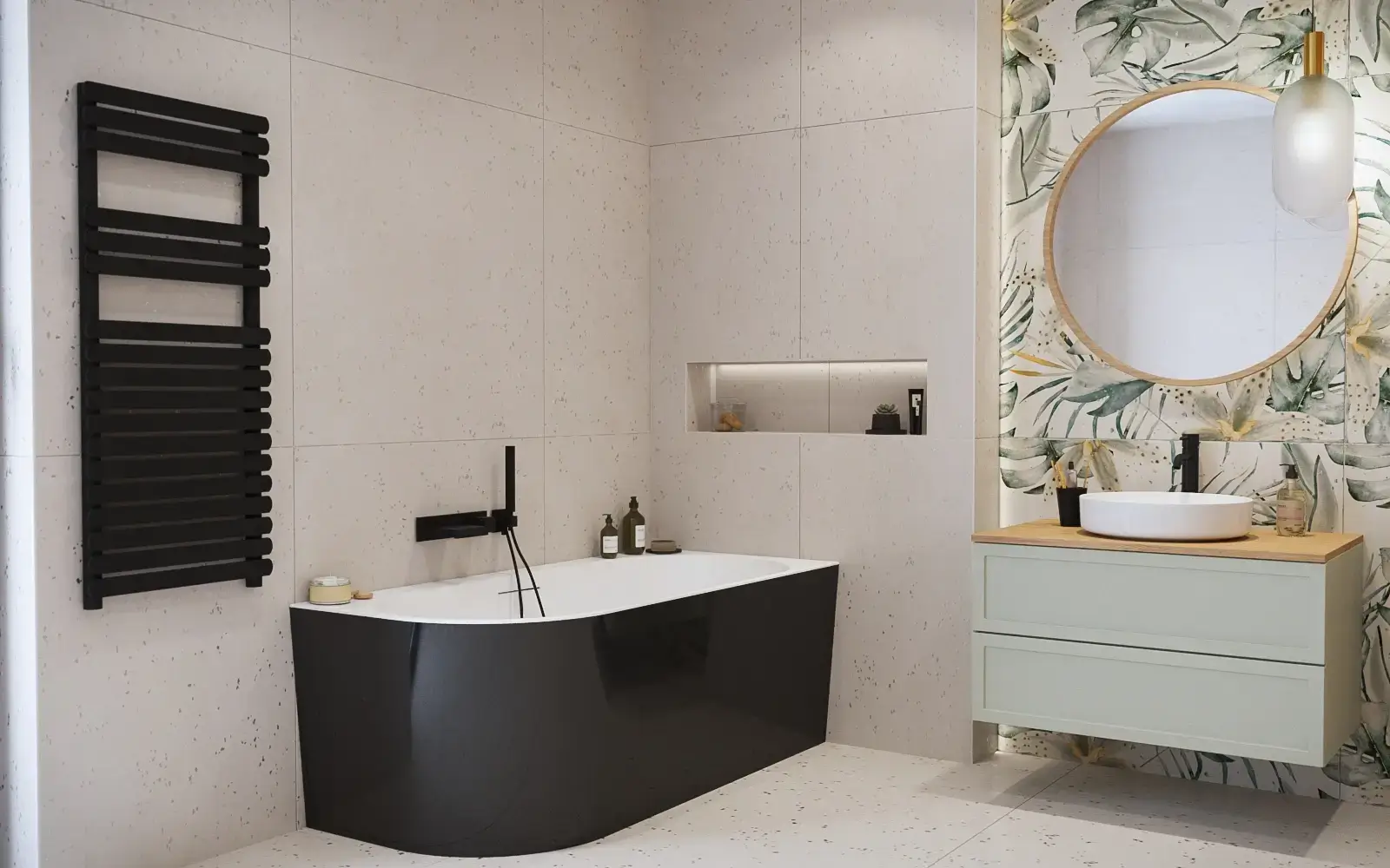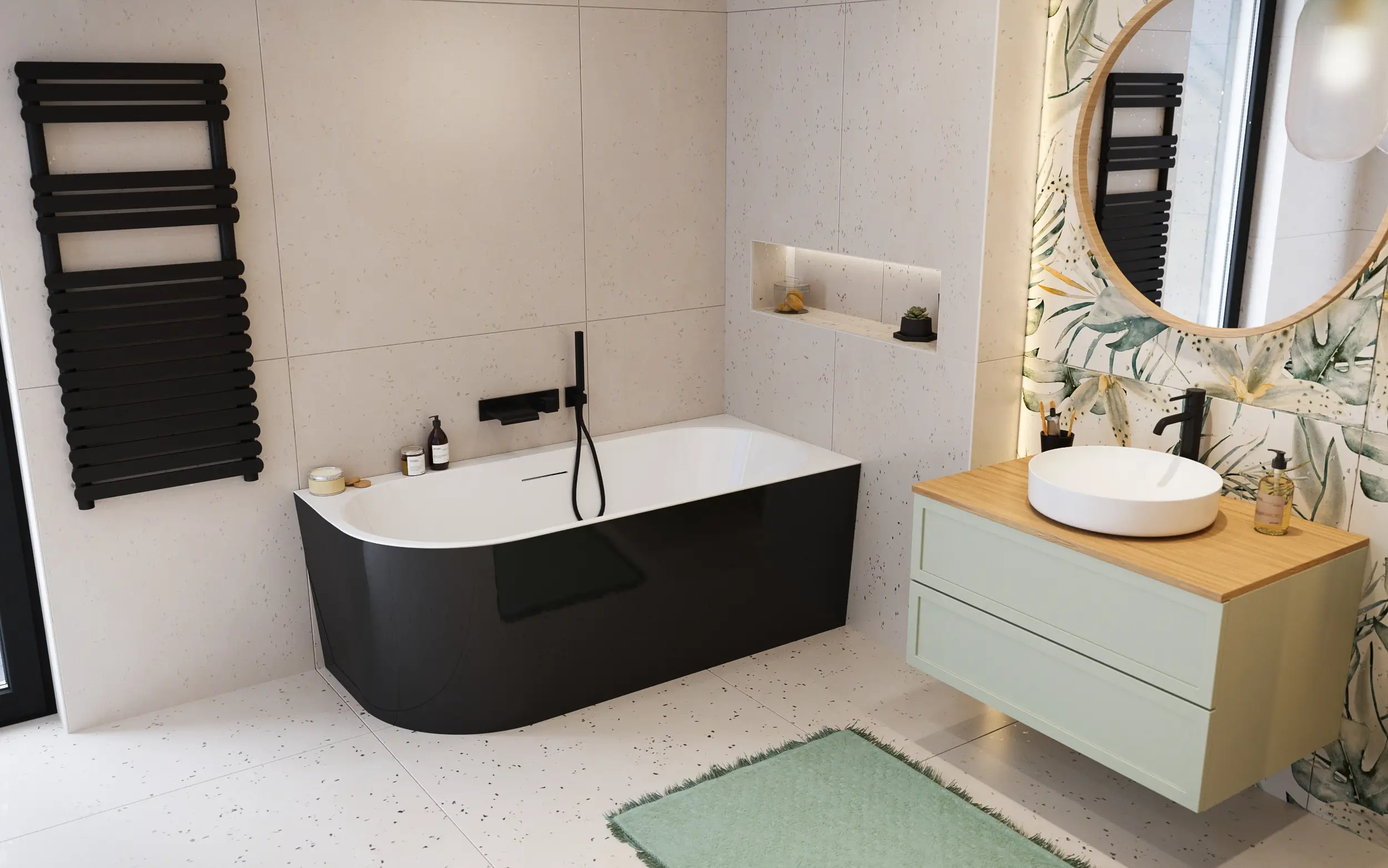 - Ötvözi az aszimmetrikus sarokkád és a szabadon álló kádak előnyeit,